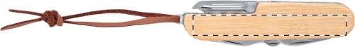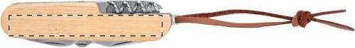 Coltellino tascabile multiuso in acciaio con 9 funzioni, manico in bambù e cordoncino in pelle PU.