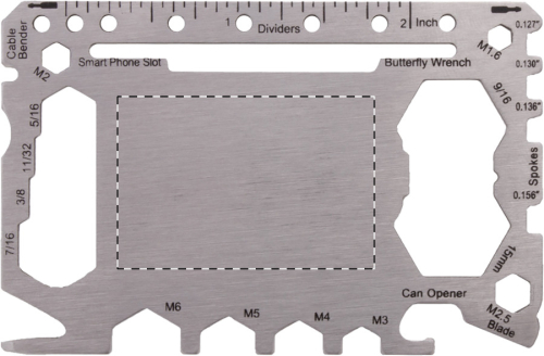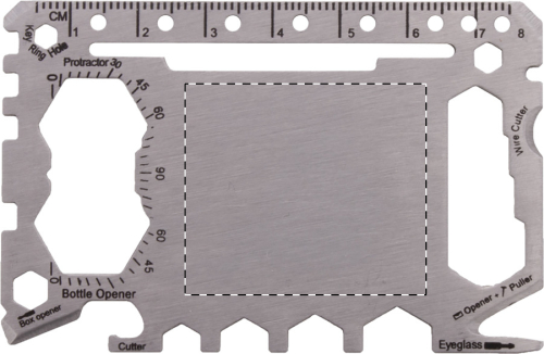 Multiutensile in acciaio a forma di carta di credito con 20 funzioni, in astuccio di pelle PU.