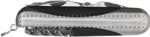 Coltello tascabile in metallo con 11 funzioni ed inserto in plastica.