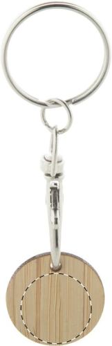 Portachiavi a moschettone in metallo con moneta per carrello della spesa in bambù. Dimensioni della moneta: ø23×2 mm.