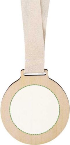 Medaglia in legno di tiglio di 7 cm di diametro e 4 mm di spessore, fissata a un cordino di cotone di 90 x 2 cm. Presenta una fibbia di sicurezza in paglia di grano e PP per una maggiore ecocompatibilità e comodità.