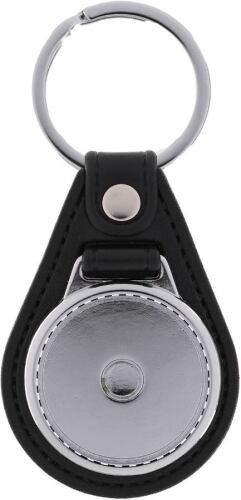 Portachiavi circolare in pelle PU con anello in metallo e stampa con resina epossidica. Il prezzo include la stampa epossidica. Quantità minima: 100 pezzi.