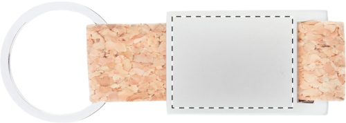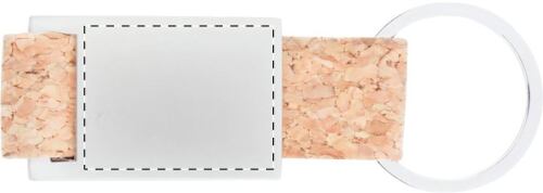 Portachiavi rettangolare in metallo con fascetta in sughero naturale e anello in metallo.