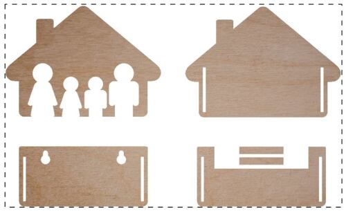 Portachiavi a muro a forma di casa con 4 portachiavi rimovibili. Realizzato in compensato di betulla.