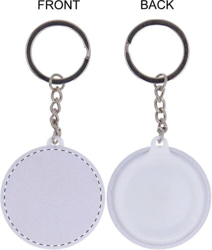 Piccolo portachiavi a bottone con copertura in microfibra RPET a colori. Il costo comprende la stampa in sublimazione. MOQ: 100 pezzi.