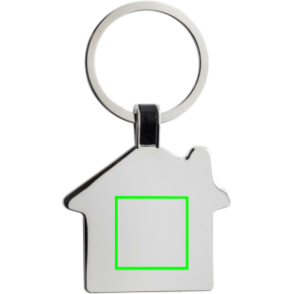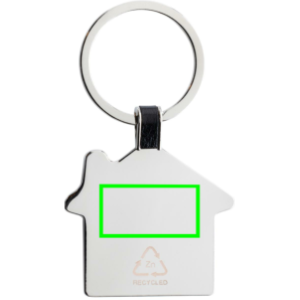 Portachiavi a forma di casa in lega di zinco riciclato RCS. Contenuto totale riciclato: 84% in base al peso totale dell'articolo. La certificazione RCS garantisce una filiera completamente certificata dei materiali riciclati. Confezionato in un sacchetto di carta.