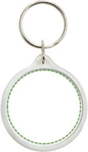 Portachiavi in plastica con anello metallico a forma rotonda.