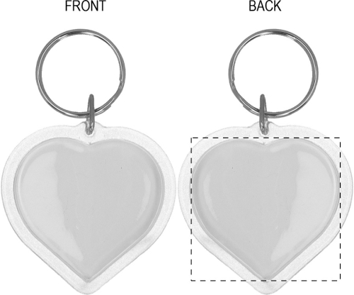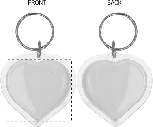Portachiavi a forma di cuore in acrilico con inserto cartaceo personalizzabile a colori e anello in metallo. Il costo comprende la stampa digitale su entrambi i lati. MOQ: 100 pezzi.