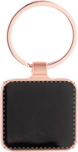 Portachiavi quadrato in metallo con finitura dorata e placca color canna di fucile. Confezione in scatola di cartoncino kraft.