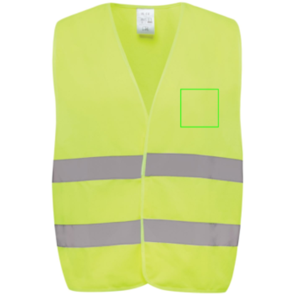Gilet di ad alta visibilità unisex di Classe 2, progettato per persone di altezza compresa tra 164 e 198 cm. Questo gilet offre ampio spazio per personalizzazioni di grandi dimensioni sia sulla parte anteriore che posteriore, rendendolo ideale per l'uso professionale in cui la visibilità è fondamentale. Presenta uno sfondo fluorescente abbinato a un nastro riflettente, che garantisce la conformità allo standard EN ISO 20471:2013+A1:2016. Inoltre il gilet è contrassegnato dal simbolo CE per garantire la sua conformità al regolamento UE 2016/425/EU, classificandolo come Dispositivo di Protezione Individuale di Categoria II. Realizzato con PET riciclato GRS. Contenuto riciclato totale: 67% in base al peso totale dell'articolo. La certificazione GRS garantisce una filiera completamente certificata dei materiali riciclati.