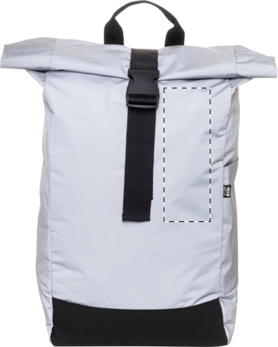 Zaino rolltop rifrangente in poliestere RPET con scomparto principale chiuso da fibbia, tasca nascosta chiusa da cerniera, scomparto imbottito per laptop (15"), tasca laterale, schienale e spallacci imbottiti. Etichetta RPET. Solo ad uso promozionale, il prodotto non può essere considerato un dispositivo di protezione personale.