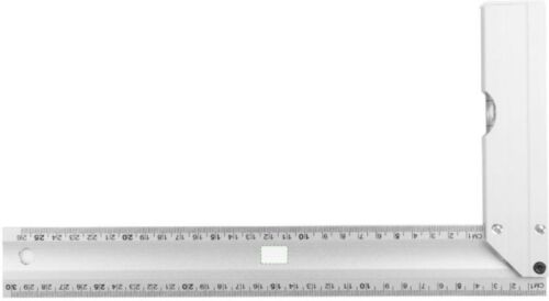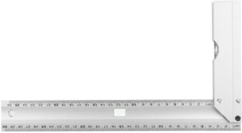 Squadra in alluminio con livella integrata, lunghezza 30 cm con indicazioni chiare in centimetri, design pratico per misurazioni e livellamenti precisi, confezionato singolarmente in una scatola in cartone avana illustrata.