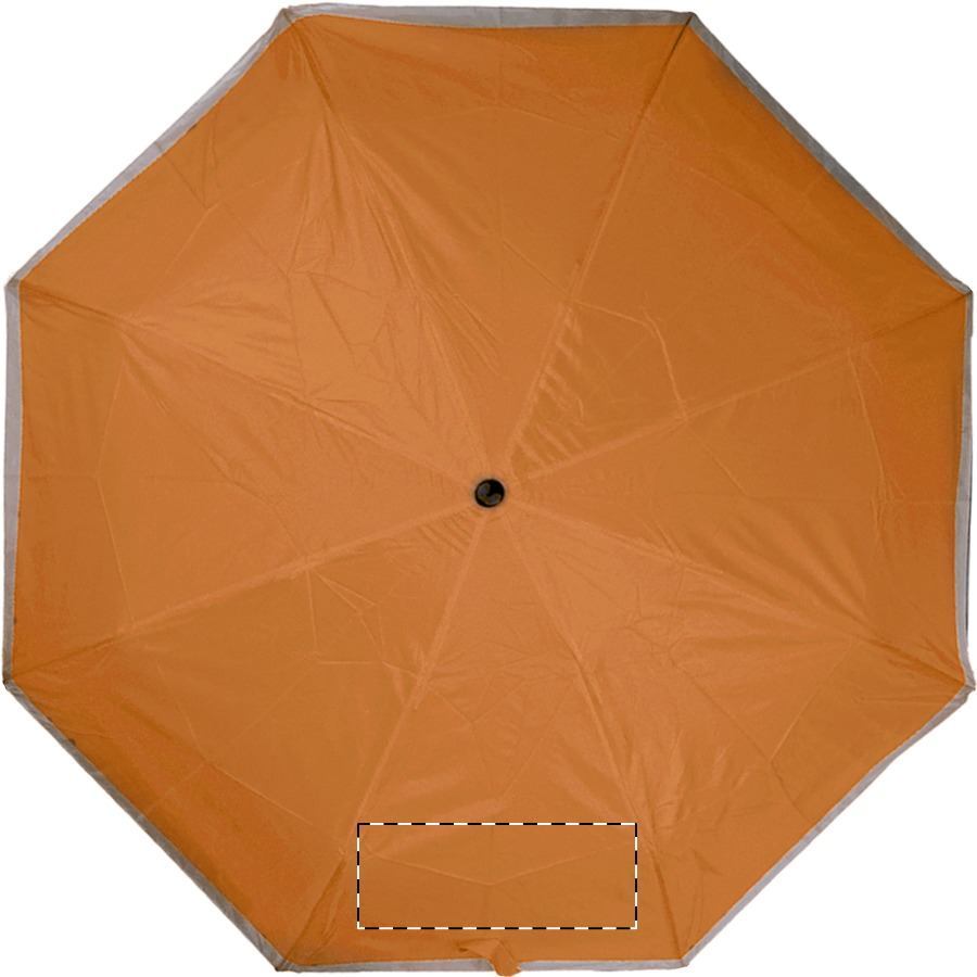 Ombrello pieghevole completamente automatico (apertura/chiusura) a 8 pannelli con parti riflettenti. Struttura antivento in alluminio, stecche in fibra di vetro e impugnatura in plastica. Fodera in colore coordinato, anch'essa con fasce riflettenti. In poliestere 190T. Solo per uso promozionale, il prodotto non può essere considerato un dispositivo di protezione personale.