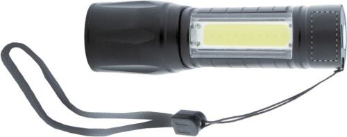 Torcia in alluminio con batteria ricaricabile USB integrata (400 mAh) e laccetto per il trasporto. Dotata di luce COB ad alta potenza zoomabile e sorgente luminosa COB sul lato. Modalità di luce fissa e lampeggiante. Fornita con cavo di ricarica USB.