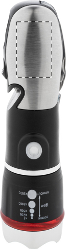 Torcia multifunzionale in ABS e acciaio inox con martello di emergenza, taglia cinture di sicurezza e multi utensile con 9 funzioni. Luce LED zoomabile e 3 modalità di luminosità. Funziona con 3 batterie AAA, non fornite.