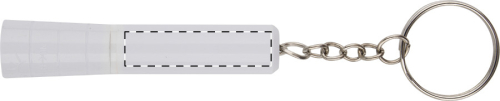 Mini torcia in plastica con 1 LED e portachiavi in metallo. Fornita di batteria a bottone.