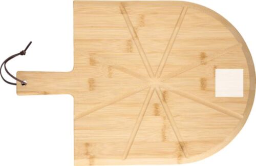 Tagliere per pizza in bambù con manico e guide pre-tagliate per facilitare il servizio. Include un tagliapizza e una spatola realizzati in acciaio inox e legno di faggio. Il manico è dotato di un cordino in PU per un pratico appendimento. Set da 3 pezzi composto da tagliere, coltello e tagliapizza. Confezionato singolarmente in una scatola di cartone avana.