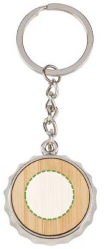 Portachiavi in lega di zinco con inserto in bambù sul davanti e apribottiglie integrato sul retro, dotato di anello portachiavi in metallo, confezionato singolarmente in un sacchetto di carta.