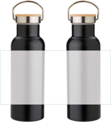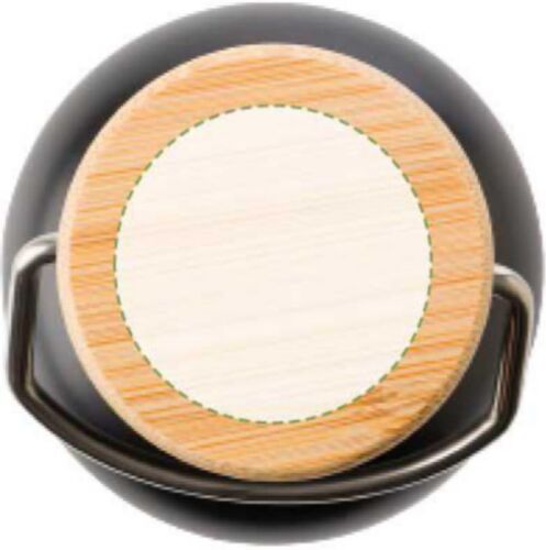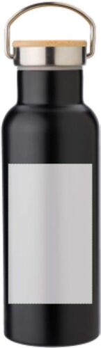 Borraccia in acciaio inox a doppia parete, tappo a vite in bambù, capacità 500 ml. A temperatura ambiente mantiene approssimativamente il liquido 4 ore freddo e 3 ore caldo.