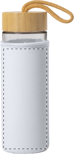 Borraccia da 530ml. in vetro con tappo in bambù e rivestimento in neoprene bianco. Non adatta per l'utilizzo con bevande gassate.