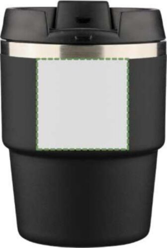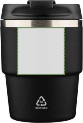 Tazza termica a doppia parete in acciaio inox riciclato con interno in acciaio inox 304 ed esterno in acciaio inox 201, finitura opaca effetto polvere e coperchio a vite in PP. Formato compatto, compatibile con la maggior parte delle macchine da caffè, include il logo “acciaio inox riciclato” inciso sul fronte, confezionata singolarmente in una scatola in cartone avana, capacità 175 ml.
