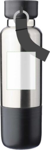 Borraccia in acciaio inox riciclato a doppia parete, con interno in acciaio inox 304 ed esterno in acciaio inox 201, corpo in argento con dettagli opachi, capacità 500 ml, include tappo a vite con vano incorporato in AS trasparente, due nastri intercambiabili per in facile trasporto composto da cordino da polso e tracolla, bicchiere incorporata sul fondo in PP capacità 200 ml, confezionata singolarmente in una scatola di cartone bianca.
