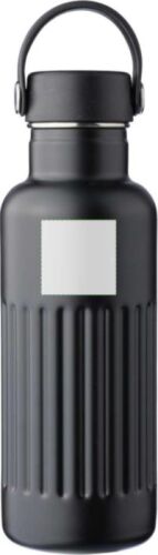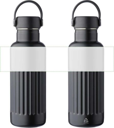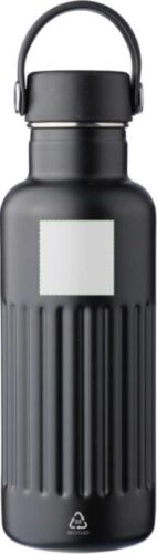 Borraccia in acciaio inox riciclato a doppia parete, con interno in acciaio inox 304 ed esterno in acciaio inox 201, design ad impugnatura a coste. Dotata di un tappo in PP e ferro con manico in TPE per un facile trasporto, include inciso sulla parte frontale il logo “acciaio inox riciclato”, capacità 500 ml, confezionata singolarmente in una scatola di cartone avana.