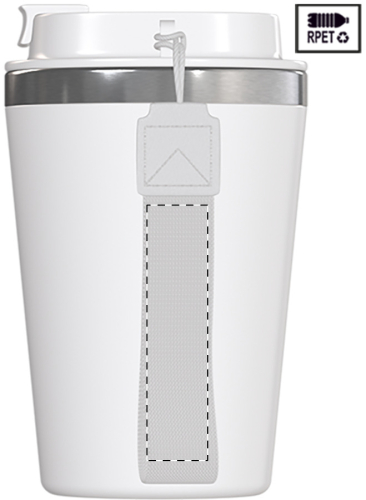 Bicchiere termico a doppia parete in acciaio riciclato da 350ml., con esterno e coperchio erogatore in plastica PP. Completo di laccetto in RPET.