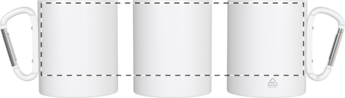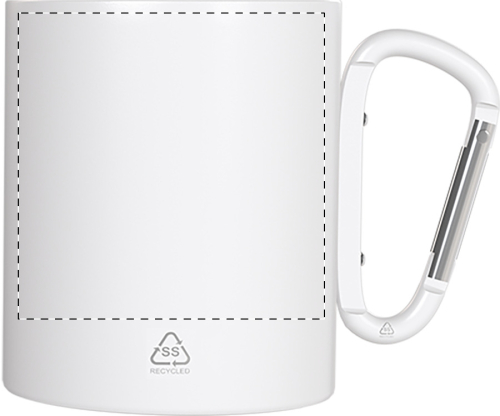 Tazza termica da 300ml. in acciaio riciclato a doppia parete, con manico a moschettone in alluminio riciclato di colore coordinato e scatola in cartoncino kraft.