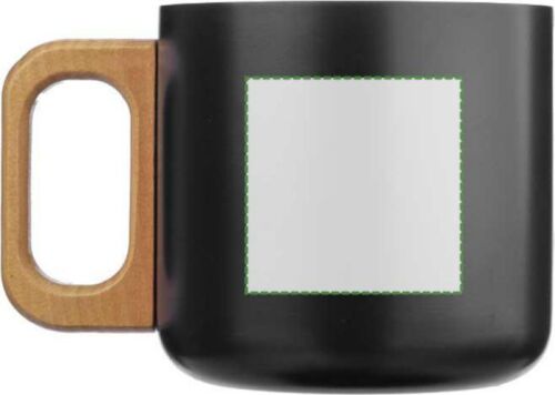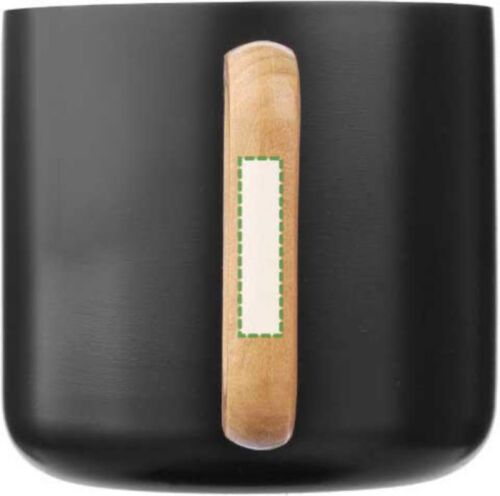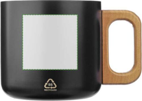Tazza termica da viaggio in acciaio inox riciclato 304 a doppia parete, manico in legno, include logo ”acciaio inox riciclato” inciso, non lavabile in lavastoviglie, confezionata singolarmente in una scatola in cartone avana, capacità da 400 ml