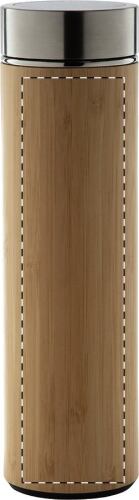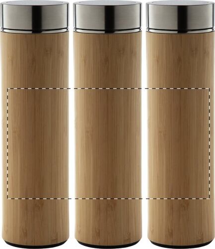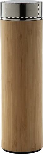 Thermos da 500ml. in acciaio a doppia parete rivestito in bambù, con infusore per il tè e termometro touch a LED sul tappo. Con batteria a bottone.