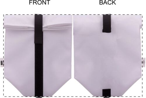 Porta merenda riutilizzabile, in poliestere 600D RPET, chiusura a velcro e resistente fodera impermeabile. Ideale per contenere snack o sandwich. Personalizzazione con grafica stampata in sublimazione su tutta la superficie. MOQ: 25 pezzi.