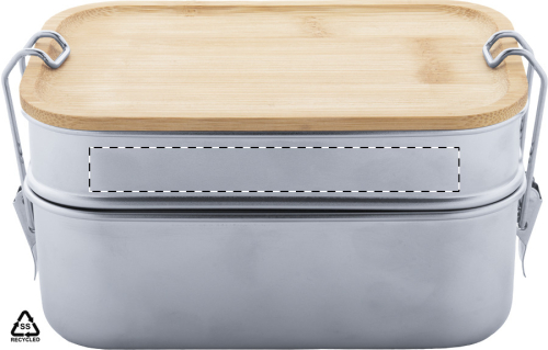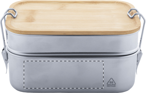 Contenitore per il pranzo in acciaio inox riciclato con coperchio in bambù e chiusura di sicurezza a fibbia. Dispone di 2 scomparti con capacità di 340 e 600 ml.