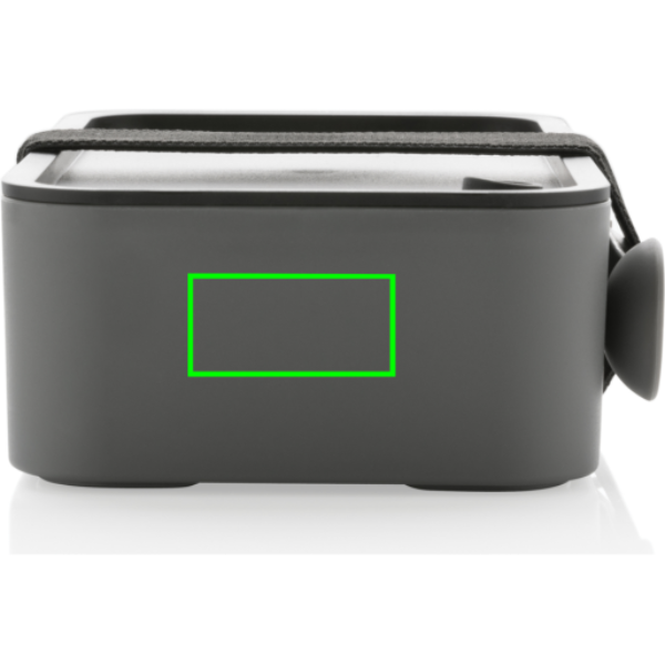 Questo elegante e robusto portapranzo si adatta perfettamente a uno stile di vita sano! È abbastanza grande per contenere panini e deliziose insalate. Realizzato con PP riciclato certificato GRS al 93%. GRS certifica tutta la filiera del materiale riciclato. Include inoltre un pratico spork e un cinturino elastico. Capacità 0,8 litri. La scatola pranzo è facile da pulire, ma non va messa in lavastoviglie né utilizzata nel microonde.