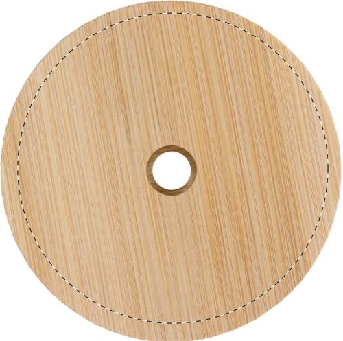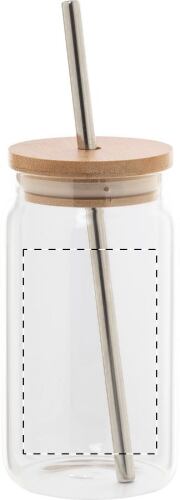 Tazza cilindrica da 450 ml. in vetro borosilicato con cannuccia in acciaio inox riciclato e coperchio in bambù, senza manico.