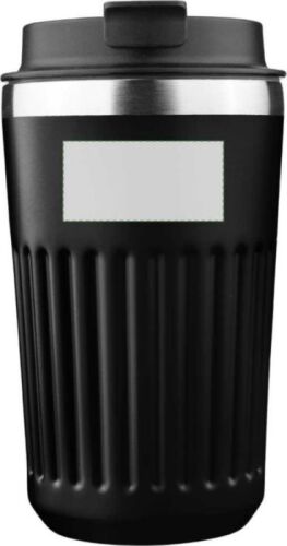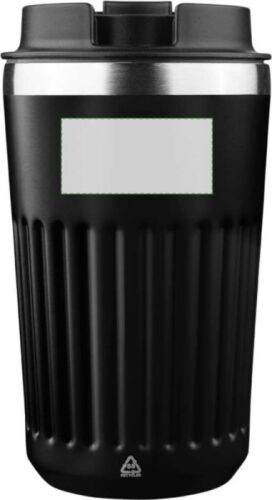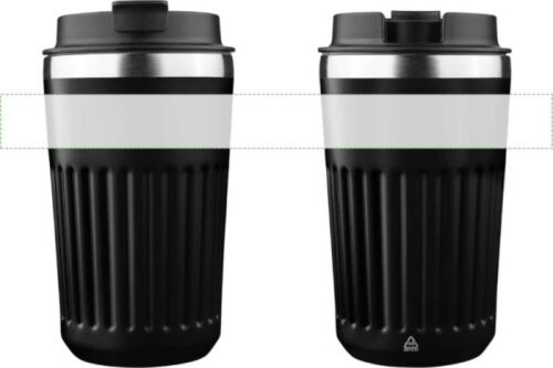 Tazza termica da viaggio in acciaio inox riciclato, doppia parete, con interno in acciaio inox 304 ed esterno in acciaio inox 201, dotata di impugnatura a coste, coperchio in PP, logo “acciaio inox riciclato” inciso sul corpo, capacità 400 ml, confezionata singolarmente in una scatola in cartone avana.