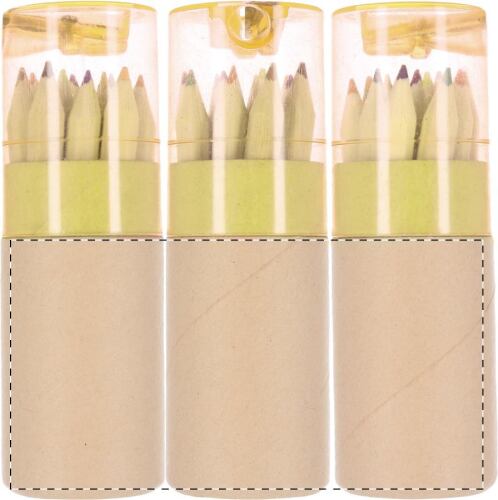 Set 12 matite colorate in confezione cilindrica in cartoncino con temperino in plastica.
