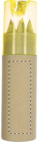 Set 6 matite colorate in confezione cilindrica di cartoncino con temperino in plastica.