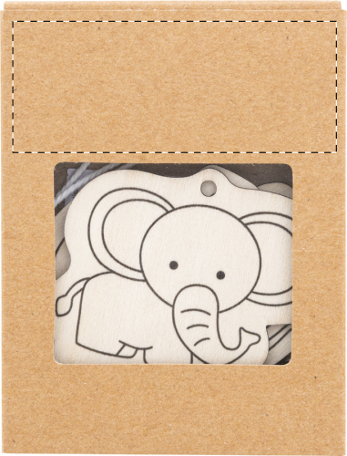 Set composto da 3 figure di animali in legno da colorare, 4 matite colorate in legno e lacci per appendere. Confezione in scatola di cartoncino kraft.