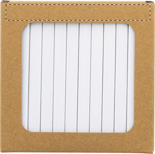Set di 12 matite colorate in legno di forma rettangolare con rivestimento bianco contenute in scatola di cartoncino kraft con ampia finestra. Ideale per la stampa UV LED su tutta la superficie.