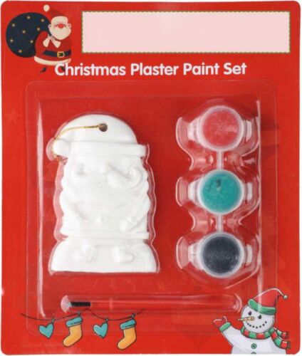 Set pittura Babbo Natale, include una figura in gesso, tre colori di vernice acrilica e un pennello. Dotato di un foro con cordino in poliestere per appenderlo come decorazione sull’albero di Natale. Tempo di attività stimato: 30–60 minuti. Confezionato singolarmente.