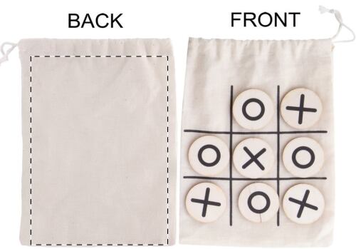 Gioco tris in compensato di betulla con 10 pedine e custodia in sacchetto contenitore. Il prezzo include una identica stampa a colori sul retro di ogni pedina. MOQ: 100 pz.