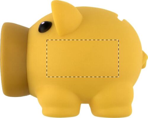 Salvadanaio in plastica a forma di maialino con naso smontabile per favorirne l'apertura.