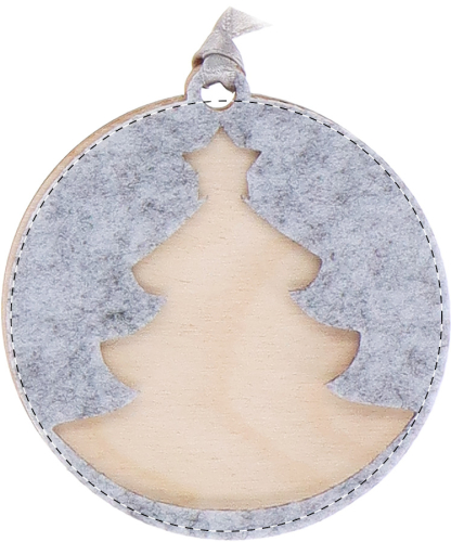 Ornamento per albero di Natale in feltro RPET a doppio strato e compensato di betulla, con nastro argentato e disegno natalizio fustellato sullo strato superiore. Il costo comprende la stampa a LED UV sullo strato inferiore. MOQ: 100 pezzi.