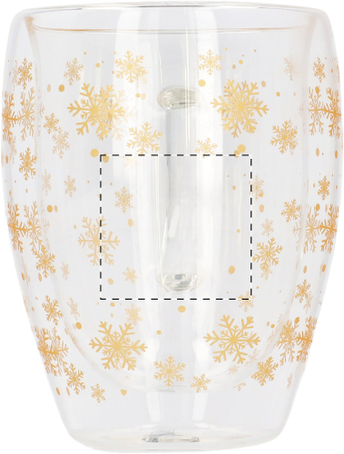 Tazza termica in vetro borosilicato a doppia parete da 350ml. con decorazione fiocco di neve natalizio e confezione in scatola di cartoncino kraft.