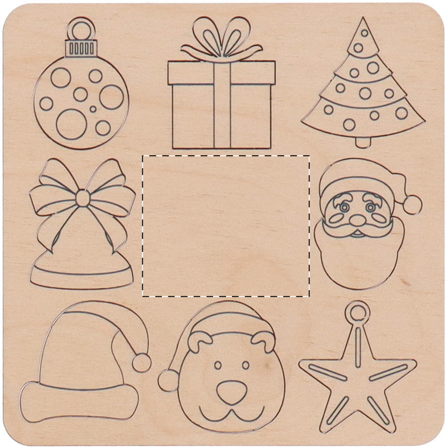Gioco da colorare con abbinamento figure natalizie in compensato di betulla con sacchetto in juta. Il gioco comprende figure fustellate a tema (8 pezzi) e matite colorate in legno (12 pezzi) contenute in una scatola di cartoncino.