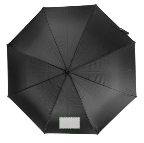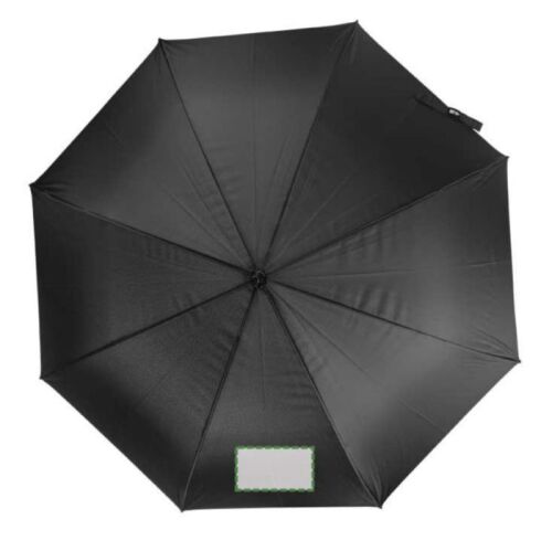 Ombrello Golf con apertura automatica in rPET 190T (27 pollici), otto pannelli, struttura in fibra di vetro, pulsante per l'apertura, etichetta in rPET sulla chiusura in velcro, antivento.