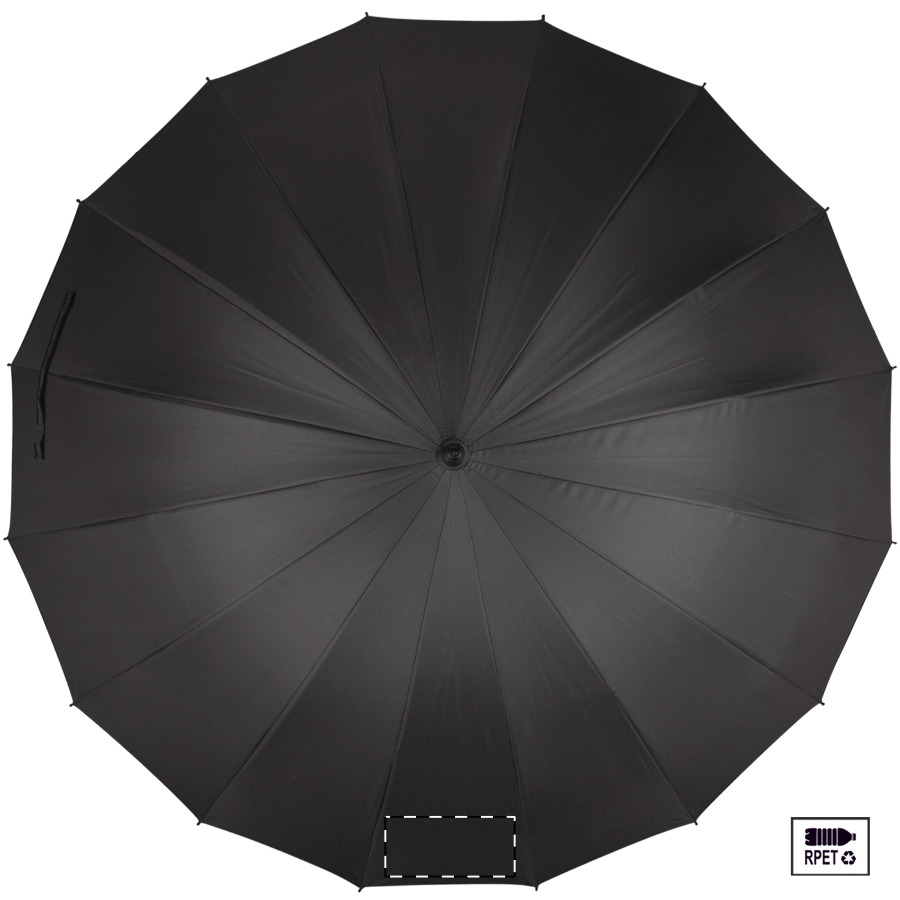 Ombrello manuale antivento in RPET 190T, con 16 pannelli, manico e asta in bambù, struttura e stecche in fibra di vetro. Custodia in colore coordinato ed etichetta RPET