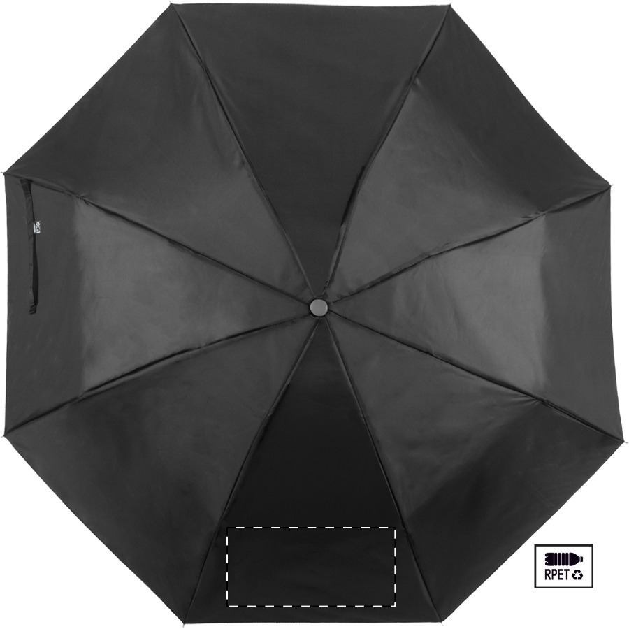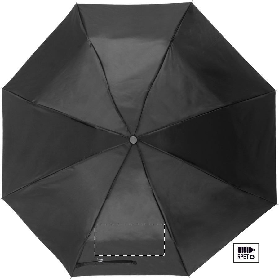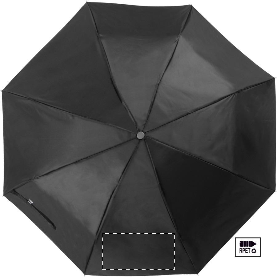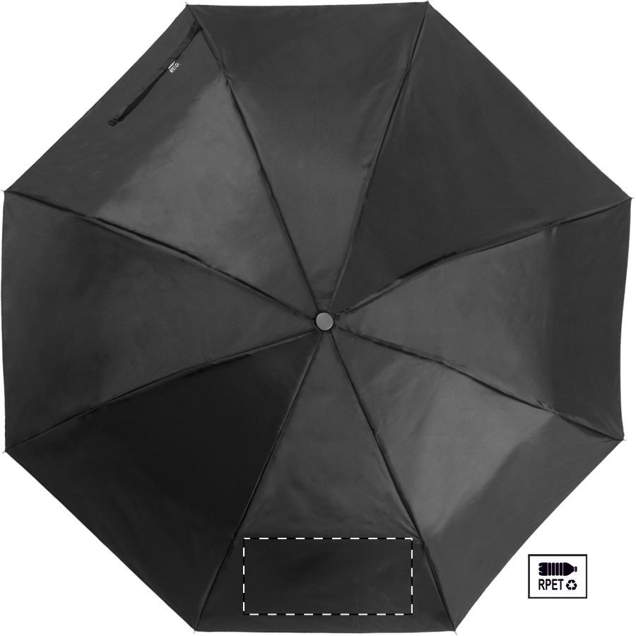 Ombrello automatico antivento in Pongee RPET, con impugnatura in legno, fodera in colore coordinato ed etichetta RPET.