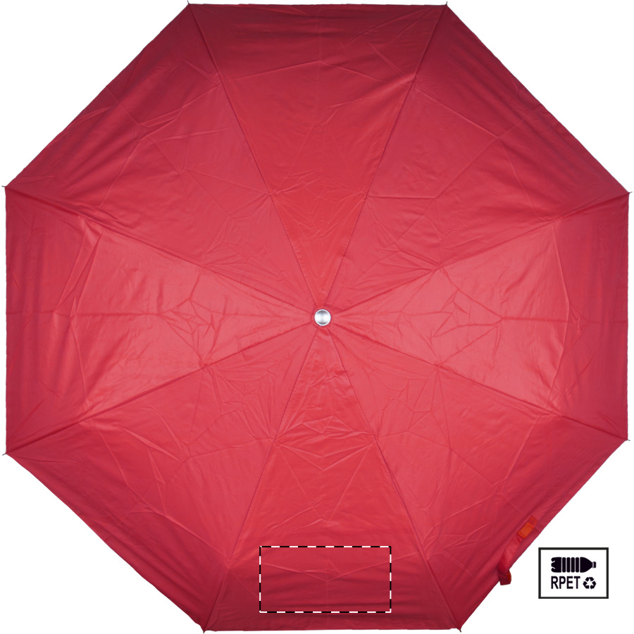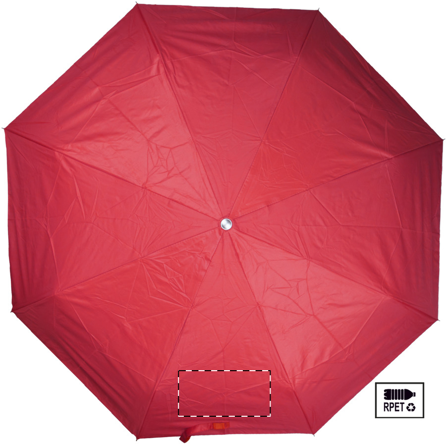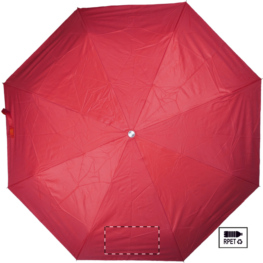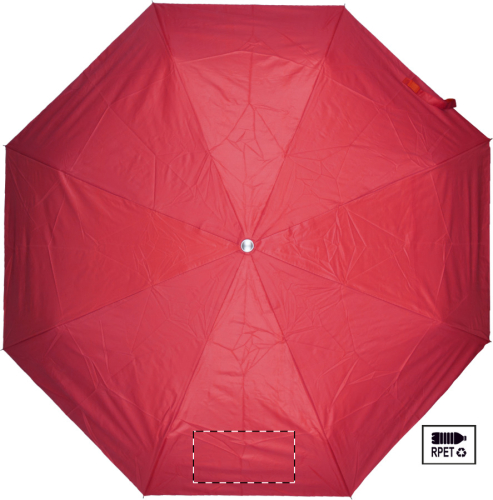 Ombrello manuale, antivento ad 8 pannelli con fodera coordinata, struttura in metallo, stecche in fibra di vetro e manico in legno. Materiale: pongee 190T RPET ed etichetta RPET.